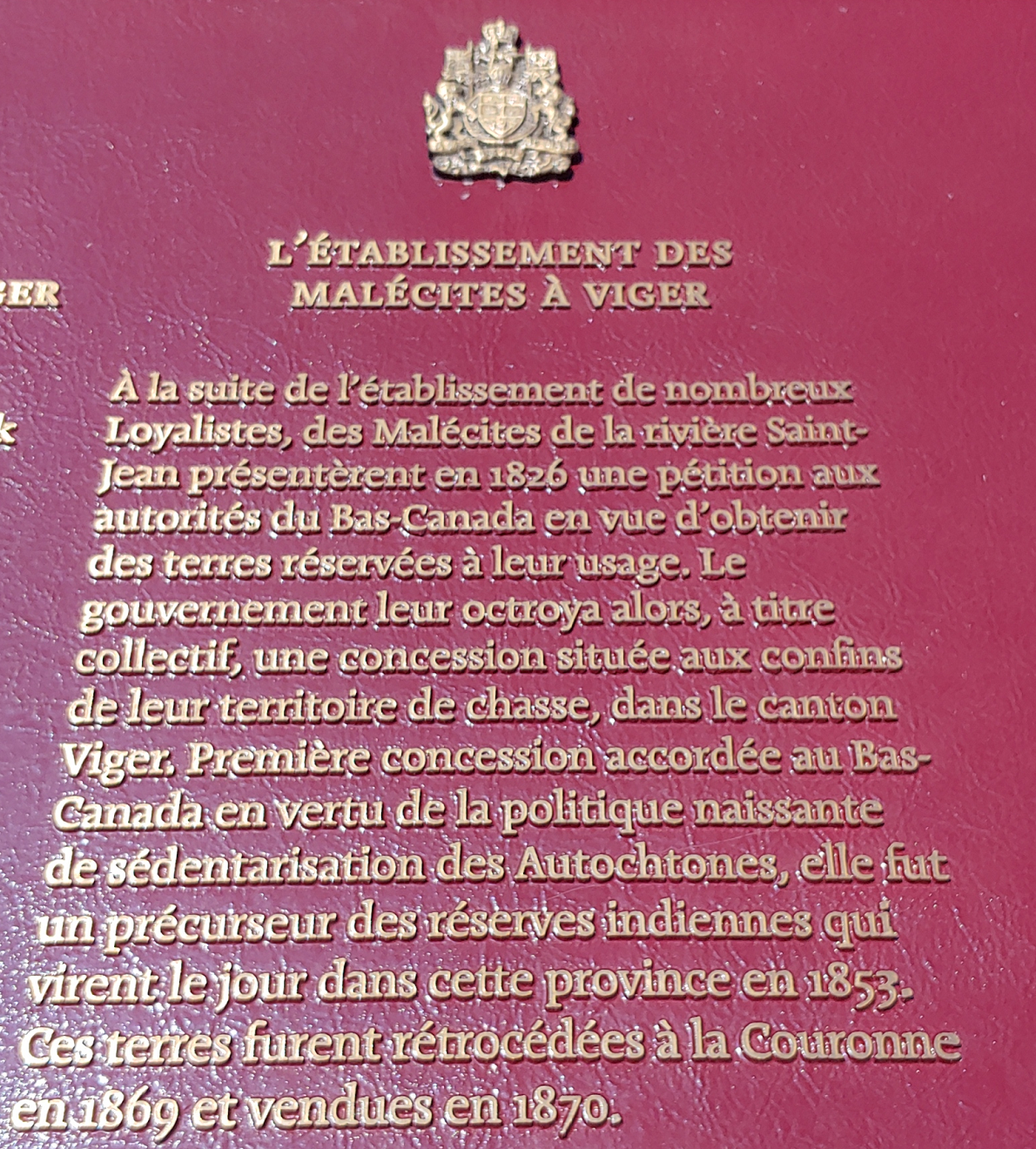 Document à la mémoire du soldat Roland Thériault (8,1 Mo) La commission des lieux et monuments historiques du Canada et Parcs Canada ont également érigé une plaque commémorative qui relate l’établissement des Malécites dans le canton Viger.